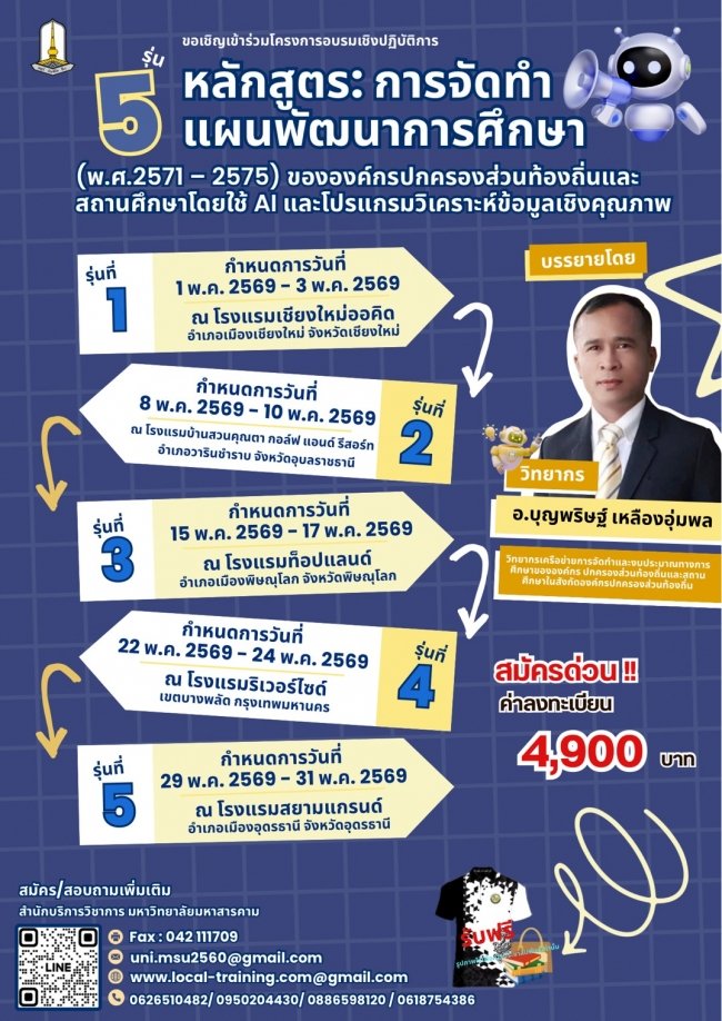 ประชาสัมพันธ์โครงการฝึกอบรมหลักสูตร “การจัดทําแผนพัฒนาการศึกษา (พ.ศ.2571 – 2575) ขององค์กรปกครองส่วนท้องถิ่นและสถานศึกษาโดยใช้ AI และโปรแกรมวิเคราะห์ข้อมูลเชิงคุณภาพ”